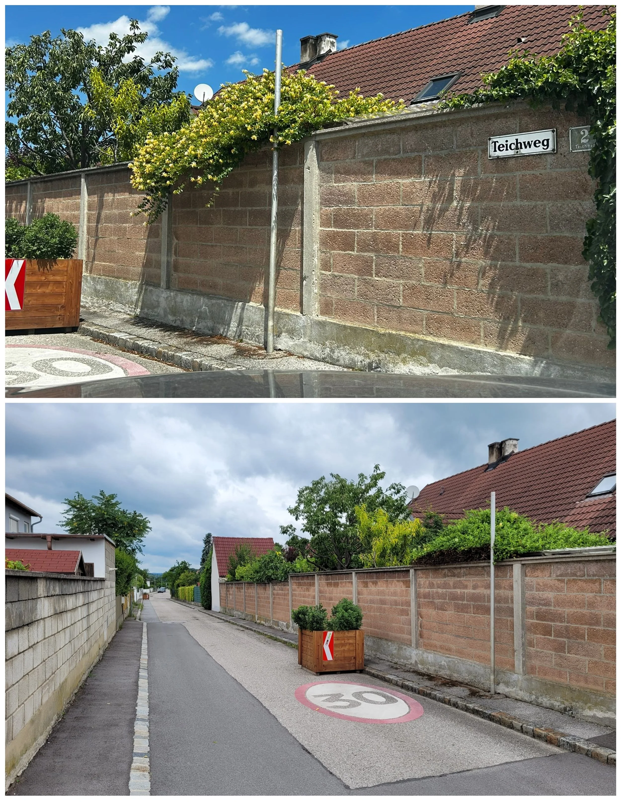 Mit den ersten Umsetzungen wurde seitens des Magistrats bereits im April 2023 begonnen. Wie am Bild ersichtlich wurden die Blumenkisten zur Verengung der Fahrbahn aufgestellt. Weitere Maßnahmen sollen schrittweise umgesetzt und evaluiert werden.