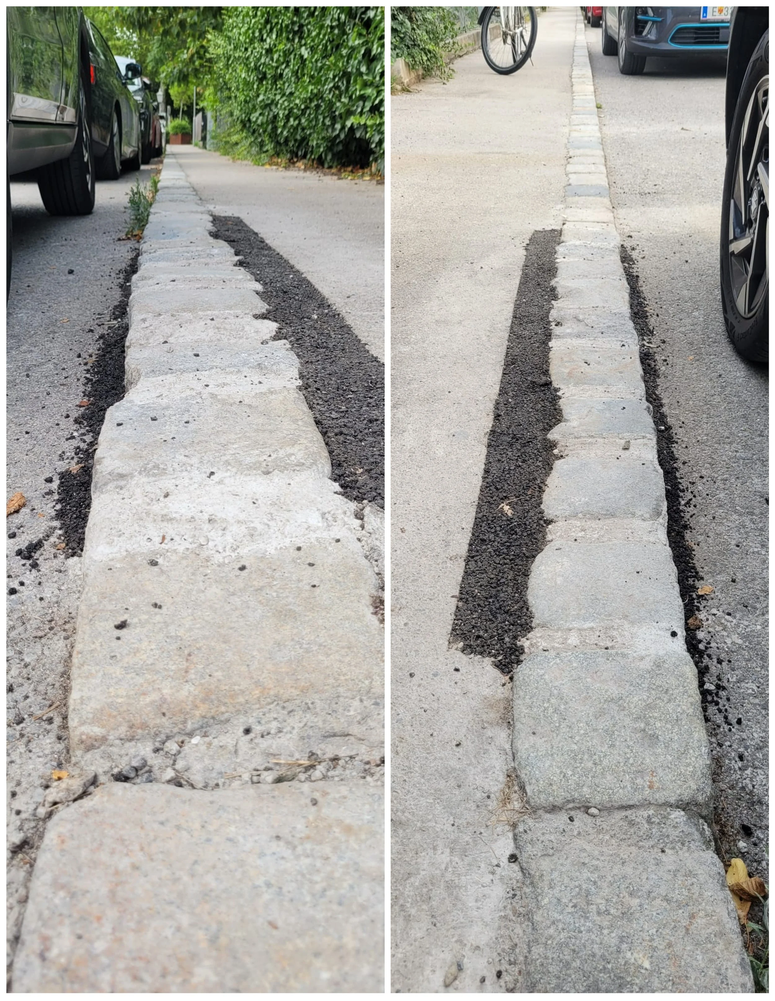 Stellungnahme des Magistrats vom 26.08.2024: Aus noch unerklärlichen Gründen haben sich hier lediglich die Randsteine gehoben (Vermutung Wurzelaufhebung). Die Unebenheit wird in den nächsten Tagen durch den Bauhof behoben werden!